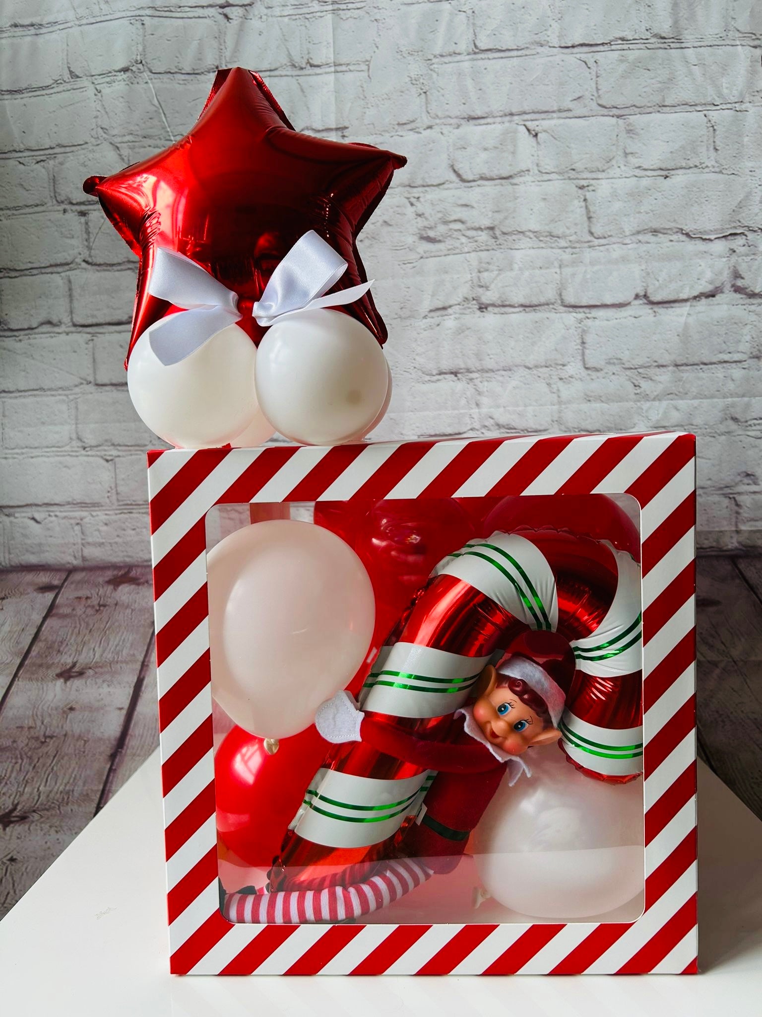 This elf arrival box is approximately 12" cubed so is perfect to stand on a table top. It contains red and white latex balloons a candy cane foil balloon and an elf.